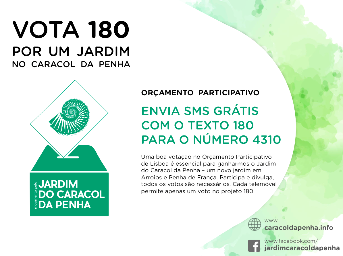 A votação para o Orçamento Participativo de Lisboa já começou e decorre até 20 de Novembro. A Liga dos Amigos do Jardim Botânico de Lisboa apoia a proposta nº 180 para a criação de um novo jardim no Caracol da Penha, em terrenos municipais. É muito fácil votar, não deixe de participar na concretização deste sonho! Agradecemos a divulgação! Precisamos de todos os votos possíveis! Lisboa vai ter mais um jardim público!